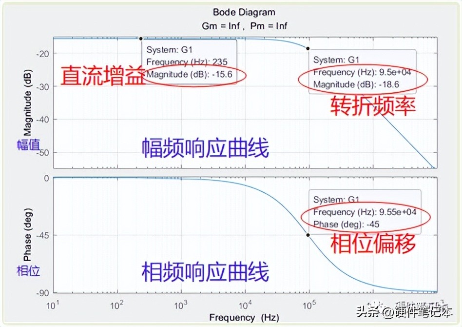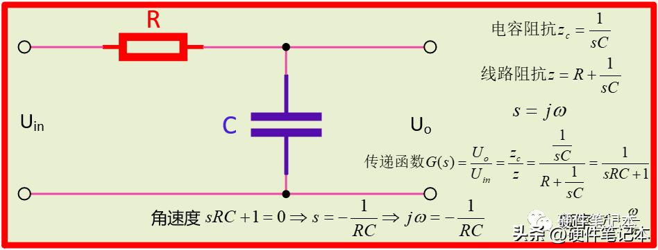 从传递函数解出一个称作为极点的根,即令传递函数的分母为零,最后得出一个频率,由于这个频率从波特图上看,曲线在这个点前后发生突变的现象,我们形象地将这个频率称为“转折频率”,转折频率意味着一个响应发生“突变”的频率点,转折意味着响应的转弯点,前后会发生较大的变化。记住波特图图横轴是频率,代表着一系列不同频率信号通过这个电路后,输出会发生不一样的变化,是一系列的信号,不是单一信号。转折频率代表了电路的固有特性,是电路参数和结构导致的结果,是电路的固有属性。