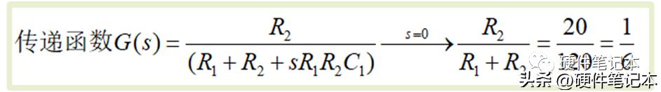 (1)直流增益,也就是低频下的增益,我们对传递函数频率项s=0,那么就得到直流增益,这也是我们在做电源环路中分析中采取的方法得到直流增益。这里直流增益如下,也就是除去了时效性动态器件的影响,纯阻性表现的特性,就是一个简单的分压电路。