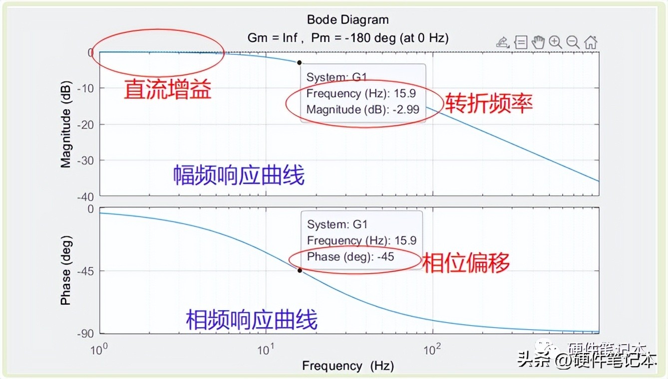 (2)转折频率的地方,这个频率的信号增益被衰减到原来的70.7%,也就是-3dB的地方,图中为-2.99dB对应转折频率为15.9Hz,这是由于实际计算转折频率为15.915Hz,存在一点误差。对相位来说,在这个频率点,相位会偏移-45°,负号表示信号被滞后了,从时间看,也就是被延时了。但是对其它不同频率信号在这个频率点前后响应出现较大的不同。之前看做不衰减也就是直流增益部分,之后信号被快速衰减,同时产生一定的相移。