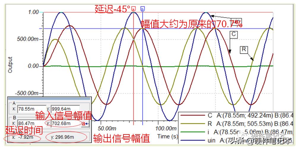 相比于输入信号Uin,稳态后,电容电压为输出信号被滞后45°,并且幅度被衰减到70.7%,从下图波形也可以看出。(稳态后,电阻上电压超前了45°,想象一下,这个电路测量对象不同,带来了“高通”和“低通”的概念)