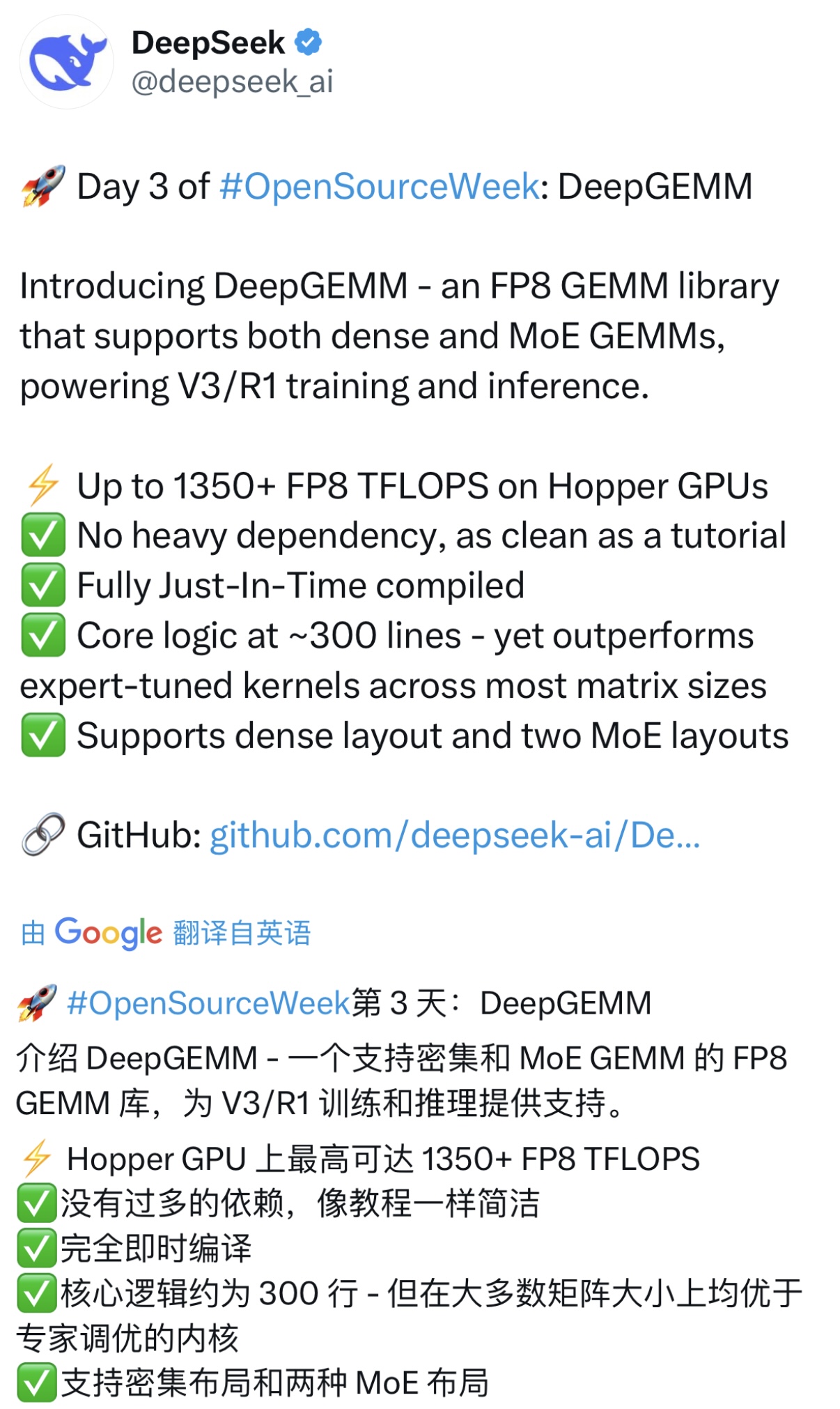 2月26日,在开源周(OpenSourceWeek)第三日,DeepSeek宣布开放高效的FP8 GEMM库DeepGEMM。