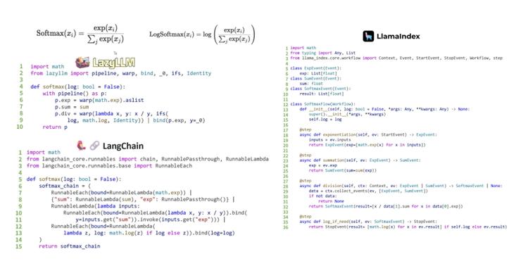 以实现一个数学公式为例,通过LazyLLM仅需10行代码,就可以实现LangChain用15行代码,LlamaIndex用30多行代码才能完成的功能。