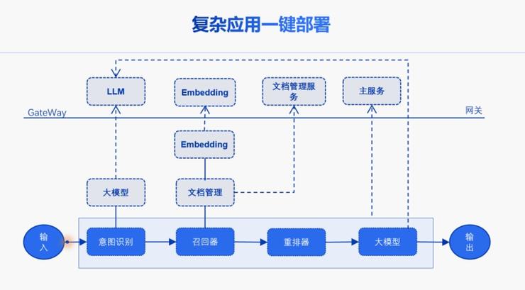 LazyLLM利用轻量网关实现了复杂应用的一键部署,使开发者能够更快地把意图识别、知识库检索能力、大模型能力等拼到一起,快速实现产品落地。当开发完成后,智能体可一键将其部署到网页、企业微信、钉钉等平台。