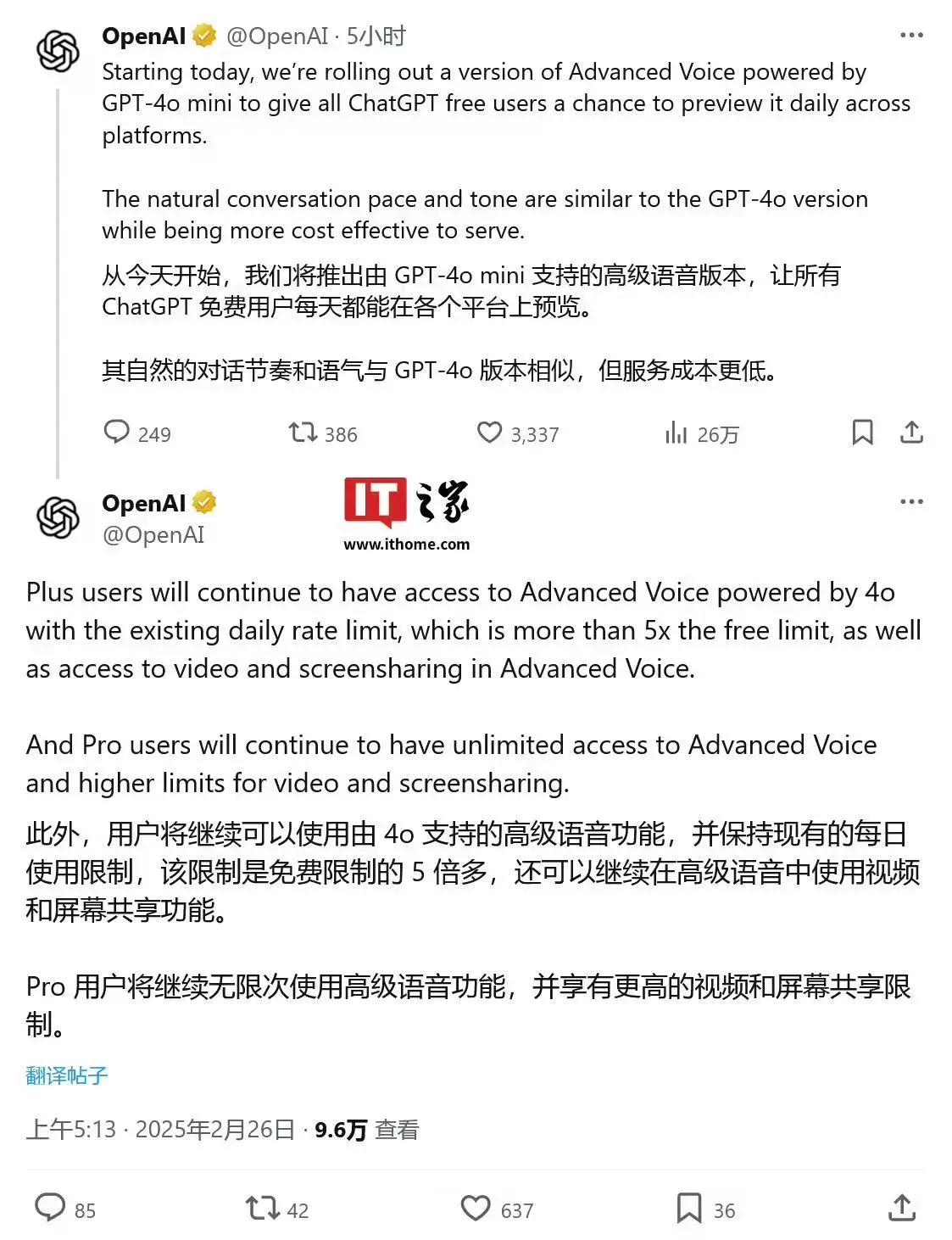 2 月 26 日消息,OpenAI 公司今天(2 月 26 日)在 X 平台发布推文,宣布免费开放 ChatGPT 高级语音模式(Advanced Voice Mode),让更多用户体验更自然的语音对话。