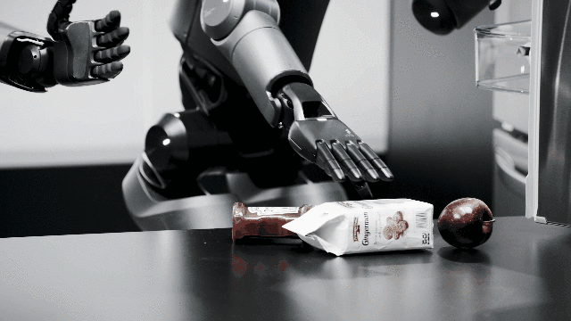 视频画面中,一台桌子,一台冰箱,两个机器人合伙一同整理物品,将它们从未见过的物品挨个分门别类放好。动作全程行云流水,无比丝滑。