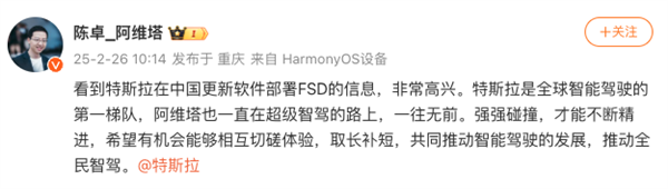 快科技2月26日消息,今天上午,阿维塔科技总裁陈卓_阿维塔在微博发文称,看到特斯拉在中国更新软件部署FSD的信息,非常高兴。