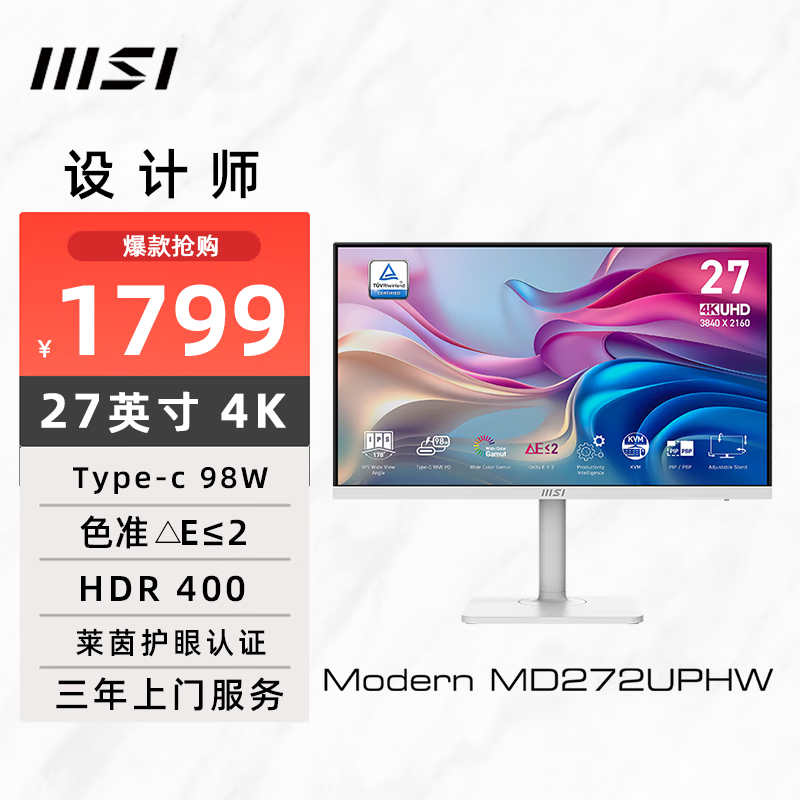 微星27英寸4K显示器,HDR400震撼视觉,会员优惠1790.01