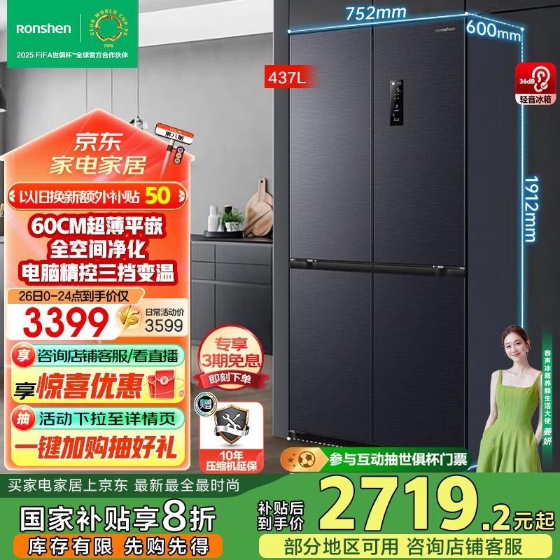 容声437L风冷十字对开门冰箱京东到手仅3399元