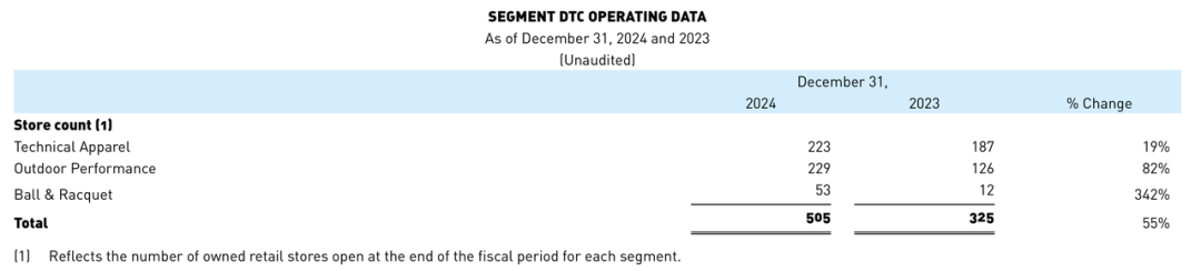 财报中可以看到,过去一年,亚玛芬旗下品牌均在大规模拓店中,以始祖鸟为核心的户外功能性服饰部门自有门店数量达到223家,同比增长19%;以萨洛蒙为核心的山地户外服饰及装备部门门店229家,同比大幅增长82%;以威尔胜为核心的球类及球拍装备部门门店53家,同比增长高达342%。