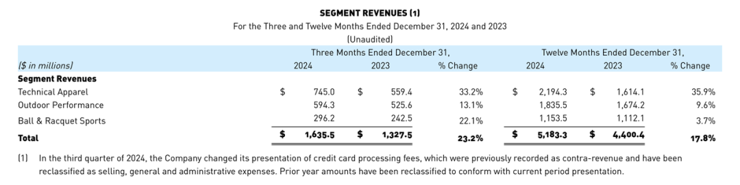其中,户外功能性服饰品牌包括Arc’Teryx始祖鸟和Peak Performance壁克峰,该分部2024年销售额增长了36%,达到21.94亿美元,按固定汇率计算增长了38%。