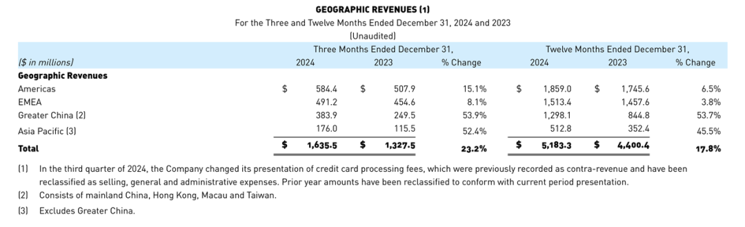 2024年,亚玛芬体育的营业收入同比增长18%达51.83亿美元(约合人民币376亿元),营业利润同比增长56%至4.71亿美元。其中,大中华区营收12.98亿美元同比增长53.7%,约占亚玛芬营收规模的25%。