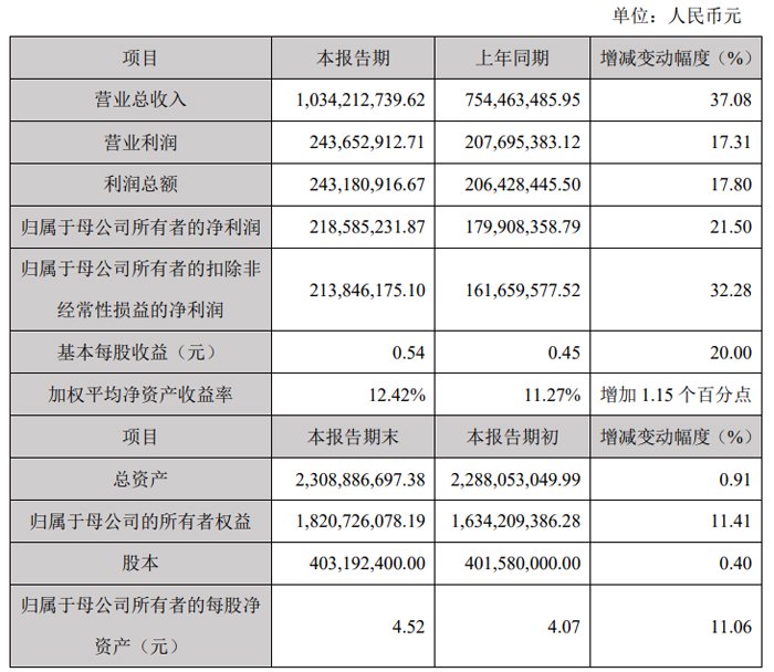 2月25日,浙江蓝特光学股份有限公司发布2024 年度业绩快报公告。2024年度,公司实现营业总收入10.34亿元,较上年同期增长37.08%;营业利润 2.44亿元,较上年同期增长 17.31%;利润总额 2.43亿元,较上年同期增长 17.80%;归属于母公司所有者的净利润 2.19亿元,较上年同期增长 21.50%;归属于母公司所有者的扣除非经常性损益的净利润2.14亿元,较上年同期增长 32.28%;基本每股收益 0.54 元,较上年同期增长 20.00%。