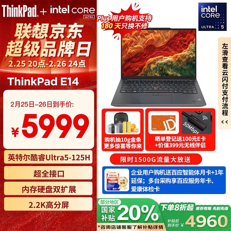 ThinkPad E14笔记本电脑酷睿Ultra5处理器32G内存1T存储学生认证优惠