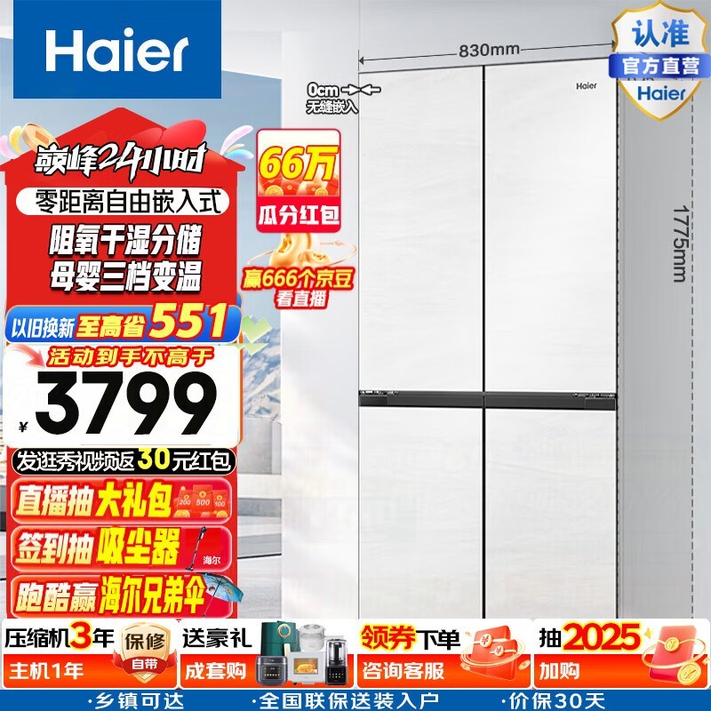 海尔462L十字对开门冰箱促销到手仅2913元