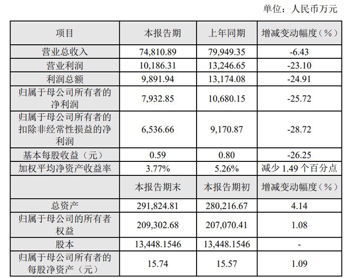 报告期末,公司总资产 291,824.81 万元,同比增长 4.14%;归属于母公司的所有者权益 209,302.68 万元,同比增长 1.08%;归属于母公司所有者的每股净资产 15.74 元,同比增长 1.09%。