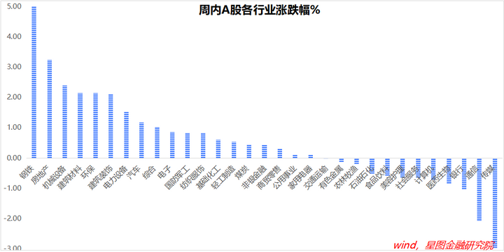 周内来看,钢铁、房地产、机械设备、建筑材料等涨幅靠前;传媒、通信、银行、医药生物、计算机等跌幅靠前。周期板块似乎已有行情启动迹象。