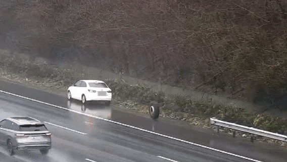 当时,该半挂车行驶至事发路段时,固定部件断裂,轮胎突然滚落。轮胎一路飞驰,最终撞上了停在应急车道的白色小车。