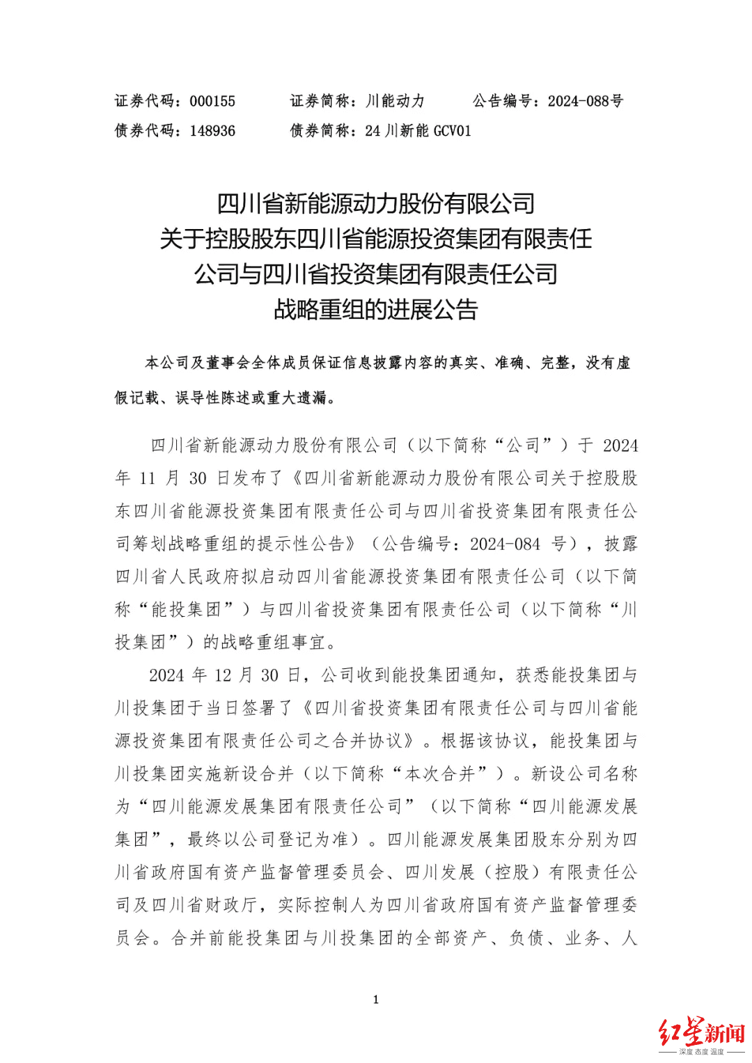 2024年12月30日,川投集团与能投集团签署了《四川省投资集团有限责任公司与四川省能 源投资集团有限责任公司之合并协议》。根据该协议,川投集团与能投集团将合并成新设公司,新设公司名称为“四川能源发展集团有限责任公司”。