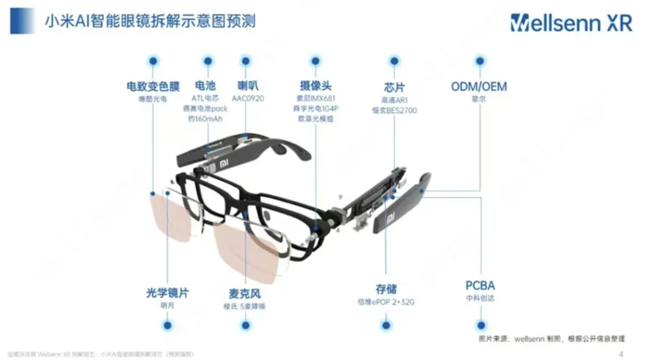 此前分析机构关于小米 AI 眼镜硬件部分的拆解预测 | 图片来源:Wellsenn XR