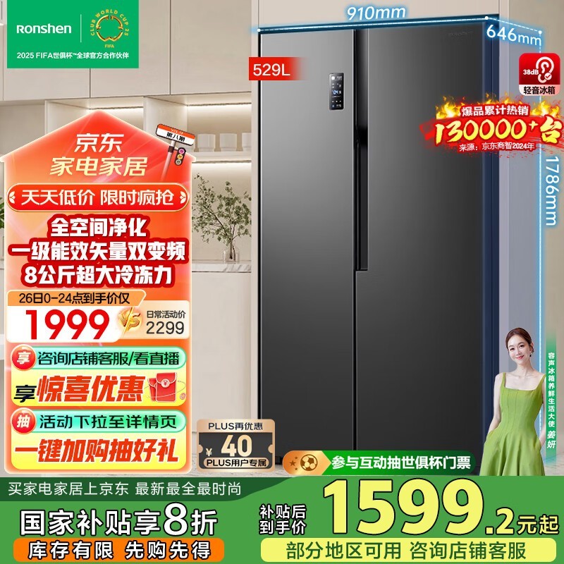容声离子净味冰箱529升对开门京东特惠1266元
