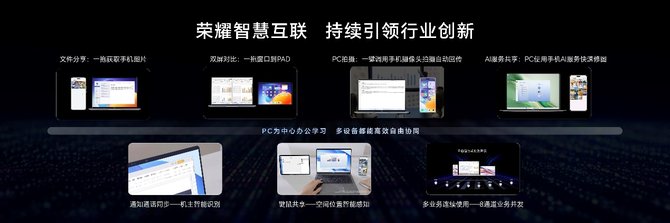过去四年,荣耀在智慧互联领域持续创新引领。基于MagicRing信任环技术,实现了手机文件拖取、调用手机摄像头、使用手机AI快速修图、键鼠共享、通知通话同步等领先的互联体验。