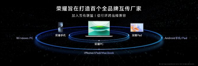 荣耀MagicRing信任环能力进一步赋能到跨设备生态互联中。荣耀宣布将加入互传联盟,支持信任环跨品牌兼容,让Windows PC与安卓手机和平板、iPhone、iPad、MacBook之间也能无缝兼容,打造行业首个全品牌互传厂家。预计3月份,荣耀MagicBook Pro 14将实现一键免流量高速分享文件至iPhone。