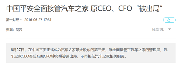 平安的人出局很合理,按照常规逻辑,这会儿海尔就该空降个领导过来接手。毕竟当年平安收购汽车之家的时候也是这样,在收购第三天,平安就把原来的 CEO 、 CFO 全部踢掉,换成了自己的心腹。