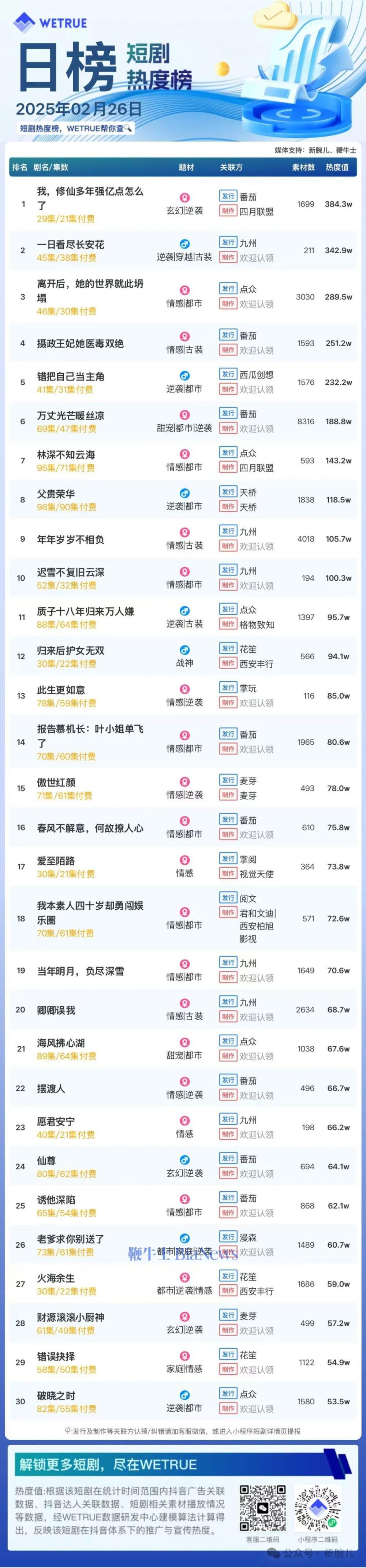 编者按:为帮助短剧从业者提供更多信息,专注于短剧报道的新腕儿和科技媒体鞭牛士联合WETRUE短剧热度榜共同推出短剧热度榜。