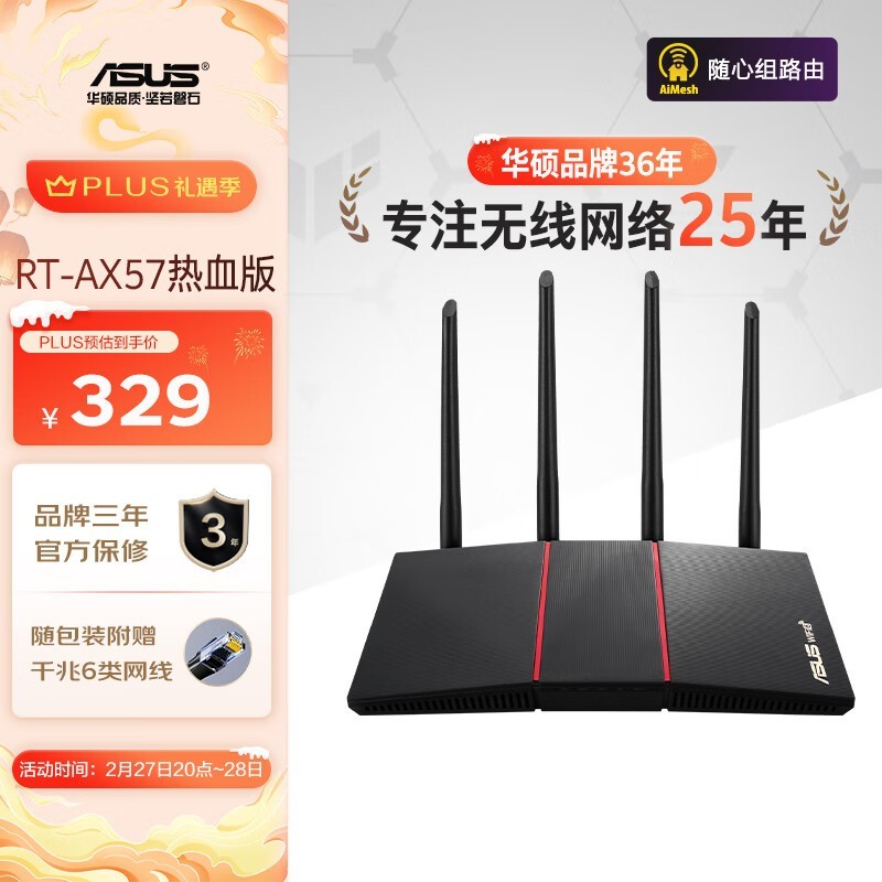 华硕RT-AX57千兆Mesh路由器Wi-Fi6双频3000M仅309元