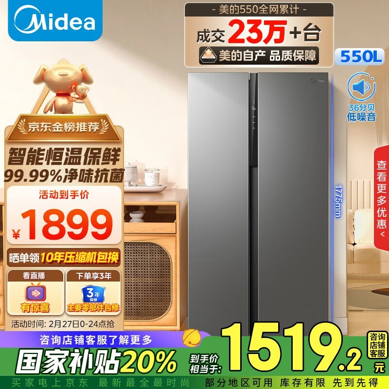 美的550L对开门冰箱BCD-550WKPZM(E)京东特惠1472元