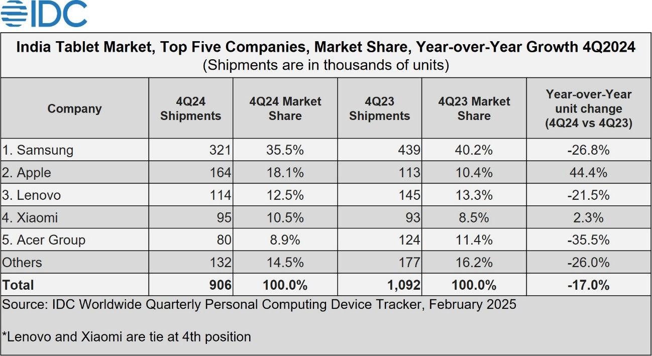 2024 年第 4 季度印度平板市场