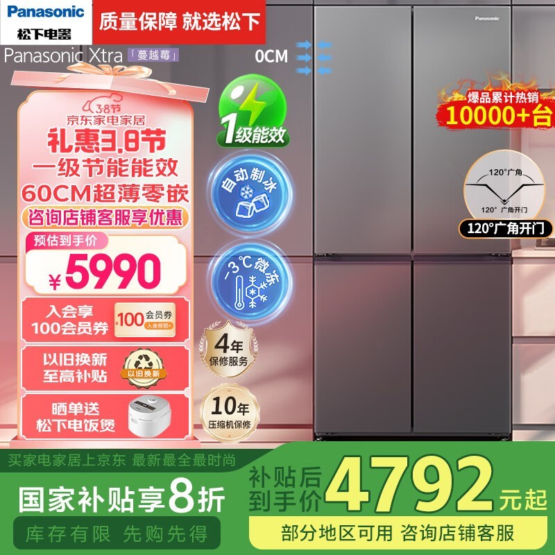 松下NR-XD50C5B-H风冷十字对开门冰箱500L大容量京东特惠
