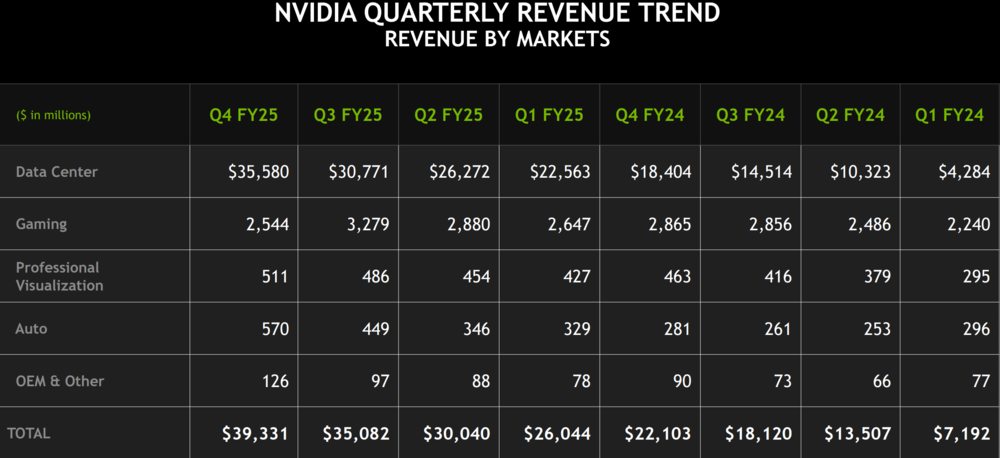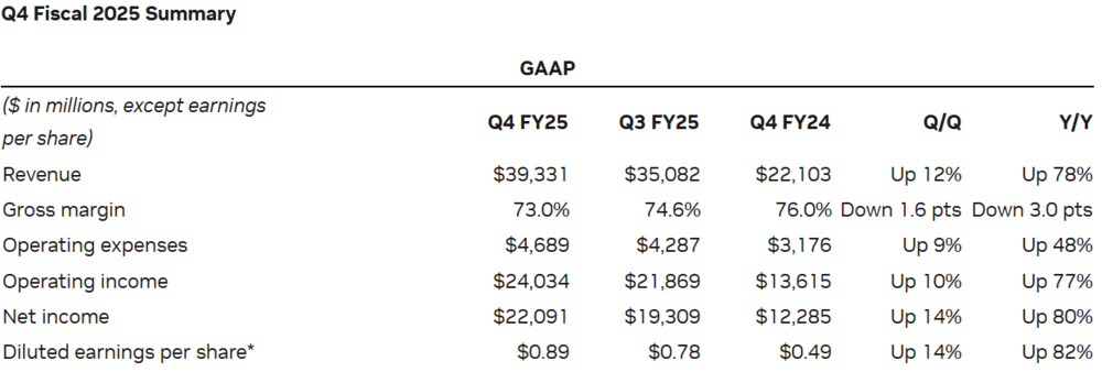 在全世界的瞩目中,英伟达交上了一份超预期的成绩单。北京时间2月27日早间,英伟达发布了截至今年一月底的2025财年第四季度业绩报告,期内营收达到393.31亿美元,同比增长78%,高于彭博综合预期(382亿美元),也超过了该公司在上季度给出的业绩指引(375亿美元);净利润220.91亿美元,同样高于彭博综合预期(209亿美元)。这样的业绩,足以为投资者们暂时服下一剂定心丸。自今年年初以来,英伟达股价进入持续震荡阶段。1月27日美股收盘,英伟达单日跌幅超过17%,市值蒸发5900亿美元,创下公司历史上单日下跌最多的记录。进入2月,英伟达股价在两周的时间里,又逐渐从116.66美元拉升到138.85美元。透过空头与多头之间的博弈,不难看出当前市场对于“AI第一股”的估值已逐渐回归理性,至于未来究竟应该是“谨慎乐观”,还是“盲目悲观”,英伟达还需要回答三个问题:在今早发布的财报中,英伟达对部分问题给出了答案。稳坐钓鱼台?毫无疑问的是,英伟达近期股价波动与DeepSeek的横空出世存在直接关系。但鉴于财报的统计范围截止至1月26日,因此后者的影响无法在本季度财报上直接体现。对于英伟达来说,过去三个月的行业变量主要体现在两方面:AI巨头公司的资本开支变化和AISC芯片企业的挑战。首先来说说AI巨头们在基础设施上的投资。虽然AI带来的收入增量完全无法与资本开支增量成正比,但至少在今年上半年,海外大厂对于AI硬件的投资仍在加码。1月底,Meta在发布四季度财报后宣布,将资本开支从2024年的392.3亿美元大幅提高至600-650亿美元,重点用于AI相关业务;微软在宣布调整部分数据中心租约策略后,又明确表示未来三年将提高基础设施的投资规模。根据Bloomberg的测算,在2025年(自然年)期间,Meta、谷歌、亚马逊和微软的合计资本开支预计达到2971.95亿美元,同比增长36.8%。这些大公司在AI硬件上的热忱,组成了英伟达本季度最坚固的基本盘。财报显示,期内英伟达数据中心收入为356亿美元,同比增长93%,较上季度环比增长16%。值得一提的是,本季度数据中心贡献了英伟达91%以上的营收,这个数字在去年同期和前年同期大约为80%与60%左右。作为一个以图形显卡起家的公司,英伟达本季度在游戏业务和专业可视化业务上的营收占比合计不到8%。数据中心业务俨然已经成为支撑公司业绩的绝对支柱。除了市场需求稳固外,外部竞争也尚未威胁英伟达的统治根基。去年12月,博通CEO陈福阳在财报发布后的电话会议上表示,公司大客户将在2027年花费600至900美元购买博通ASIC芯片,一度让看好英伟达的资本纷纷抽离,转投博通的怀抱。这里需要介绍下什么是ASIC芯片。与广义上的GPU相比,ASIC可以专为特定推理任务而定制,不需要像GPU那样为了适应各种不同的任务而进行频繁的配置和切换。同时,因为ASIC芯片只包含完成特定推理任务所需的功能模块,不需要像 GPU 那样集成大量的通用功能和接口。比如在一些简单的图像识别推理应用中,ASIC芯片完全可以去掉GPU中那些用于复杂图形处理和游戏渲染的模块,从而降低芯片成本。简单地来说,在推理任务中,ASIC芯片能使成本大幅降低。目前业内主流观点认为,在负责的大规模数据中心的推理场景下,使用ASIC芯片可以将功耗降低30%-70%;如果在边缘计算等简单数据场景中,ASIC芯片甚至可令功耗下降一个数量级。不过,就在两周前,汇丰银行等多家机构对博通做出了重估,认为市场对于后者的业绩潜力过于乐观。一项直接证据是,根据瑞银对125家AI公司的高管走访,有63%的受访者表示公司在用英伟达的GPU进行大模型推理,而在去年5月,这个数字不足50%,充分表明了英伟达已将GPU的价值扩展到预训练阶段之外。本质上,英伟达CUDA生态的垄断优势依然巨大。对于那些手握数十万张卡的大公司来说,考虑到计算中心的迁移成本和迁移周期,ASIC芯片的功耗优势现阶段可能并不显著。尽管有着上述诸多利好条件,但这并不意味着英伟达在进入2025财年后,能够高枕无忧。一方面,英伟达的毛利率正在承压。财报显示,本季度英伟达毛利率为73%,较上季度下降3个百分点,而根据最新的业绩指引,下季度英伟达的毛利率可能会进一步收缩至70.6%。另一方面,DeepSeek所带来的产业变革已无法忽视。DeepSeek利好英伟达?就在昨天,DeepSeek宣布开源DeepGEMM(通用矩阵乘法)计算库,这个核心代码仅有300行的数据库将为业内的复现工作提供有力支持。结合25日开源的全栈通信库DeepEP,DeepSeek向全球开发者提供了优化GPU通信效率、挖掘GPU性能两个维度上的工具。对于英伟达来说,好消息是DeepGEMM、DeepEP专为NVIDIA Hopper张量核心设计,且使用CUDA编写;不那么好的消息是,围绕在AI行业中的“算力焦虑”正被逐步瓦解。不过,英伟达似乎还没有自乱阵脚。就在上周,黄仁勋在参加一档节目时表示,DeepSeek-R1模型令人兴奋不已,而市场对于R1的反应存在一些误解,本质上R1的发布是利好AI市场。“我认为市场对R1的反应是,‘天哪,AI已经完了’。就像是R1从天而降,我们不再需要任何计算,但事实恰恰相反。”耐人寻味的是,在这一段的语境中,黄仁勋似乎用AI代指英伟达。但还是要说,黄仁勋的表述可能并不只是“面子话”。2月25日,英伟达宣布,开源首个基于Blackwell架构的优化方案——DeepSeek-R1-FP4。在新模型的加持下,采用Blackwell的B200达到每秒21088token的推理吞吐量,相较于H100性能提升了25倍。同时,该方案下单个toke