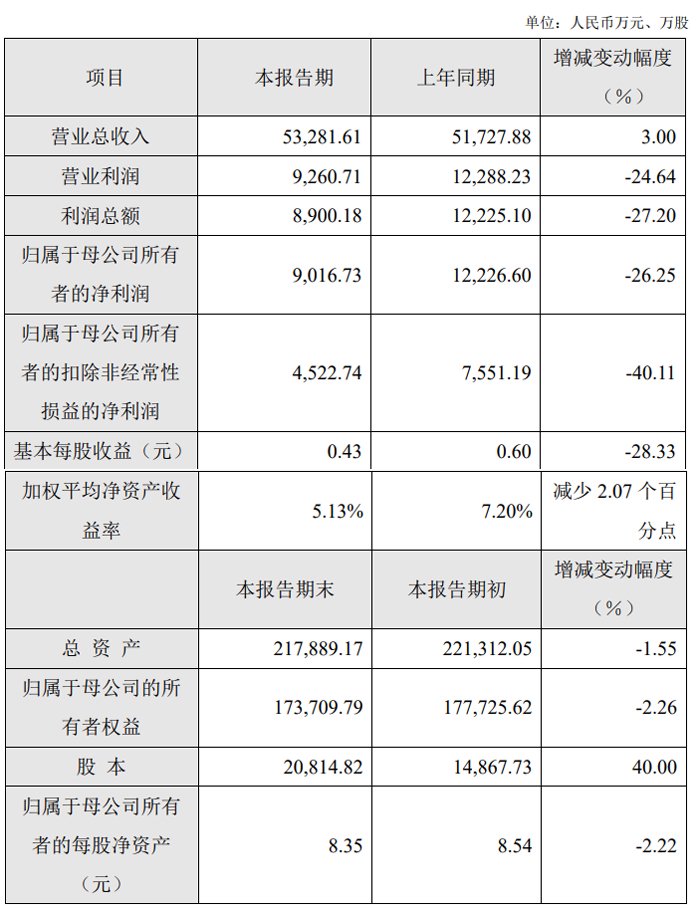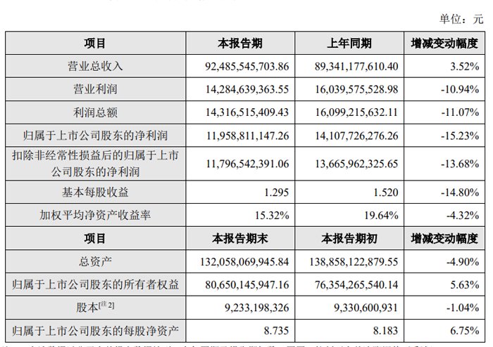 报告期末,公司总资产5,040,852.82万元,较本报告期初增长4.68%;归属于母公司的所有者权益2,086,620.12万元,较本报告期初下降2.54%;归属于母公司所有者的每股净资产10.74元,较报告期初增长1.51%。
