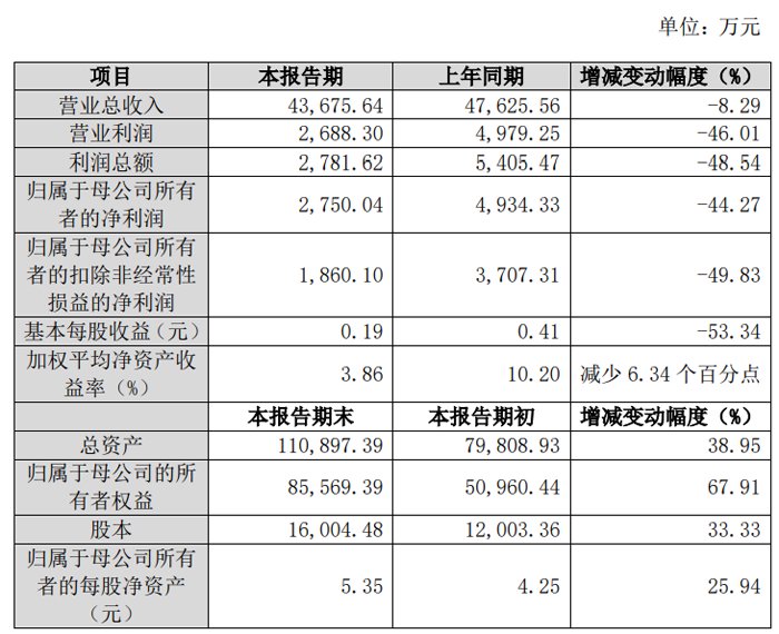报告期内,营业利润同比下降 37.63%,利润总额同比下降 38.83%,基本每股收益同比下降 38.89%,主要系报告期内公司销售产品结构发生变化导致公司毛利率下滑,并且本期加大研发投入所致。