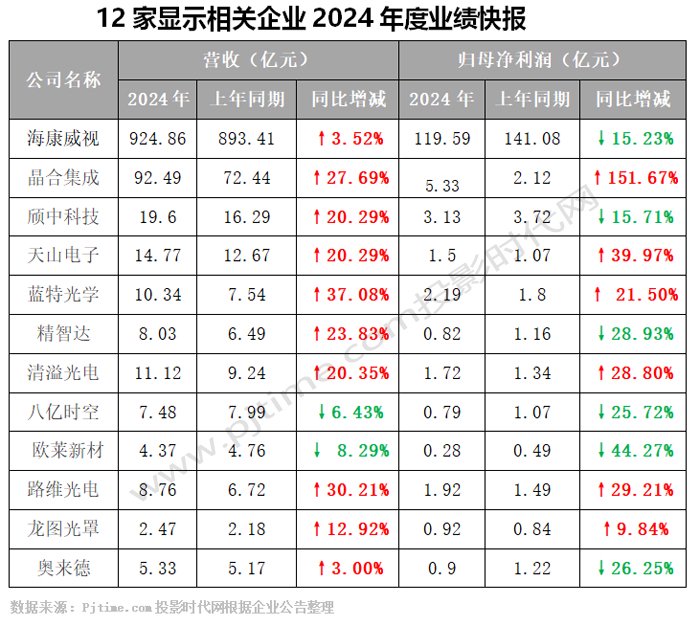 近日,海康威视、晶合集成、颀中科技、天山电子、蓝特光学、精智达、清溢光电、八亿时空、欧莱新材、路维光电、龙图光罩、奥来德等12家LED显示屏、车载显示、显示驱动、显示材料等显示相关企业陆续发布2024年度业绩快报。