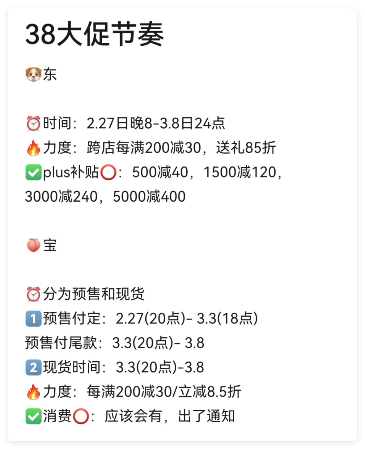高潮期:3月8日0:00-3月10日23:59(全品类爆发,优惠力度最大)