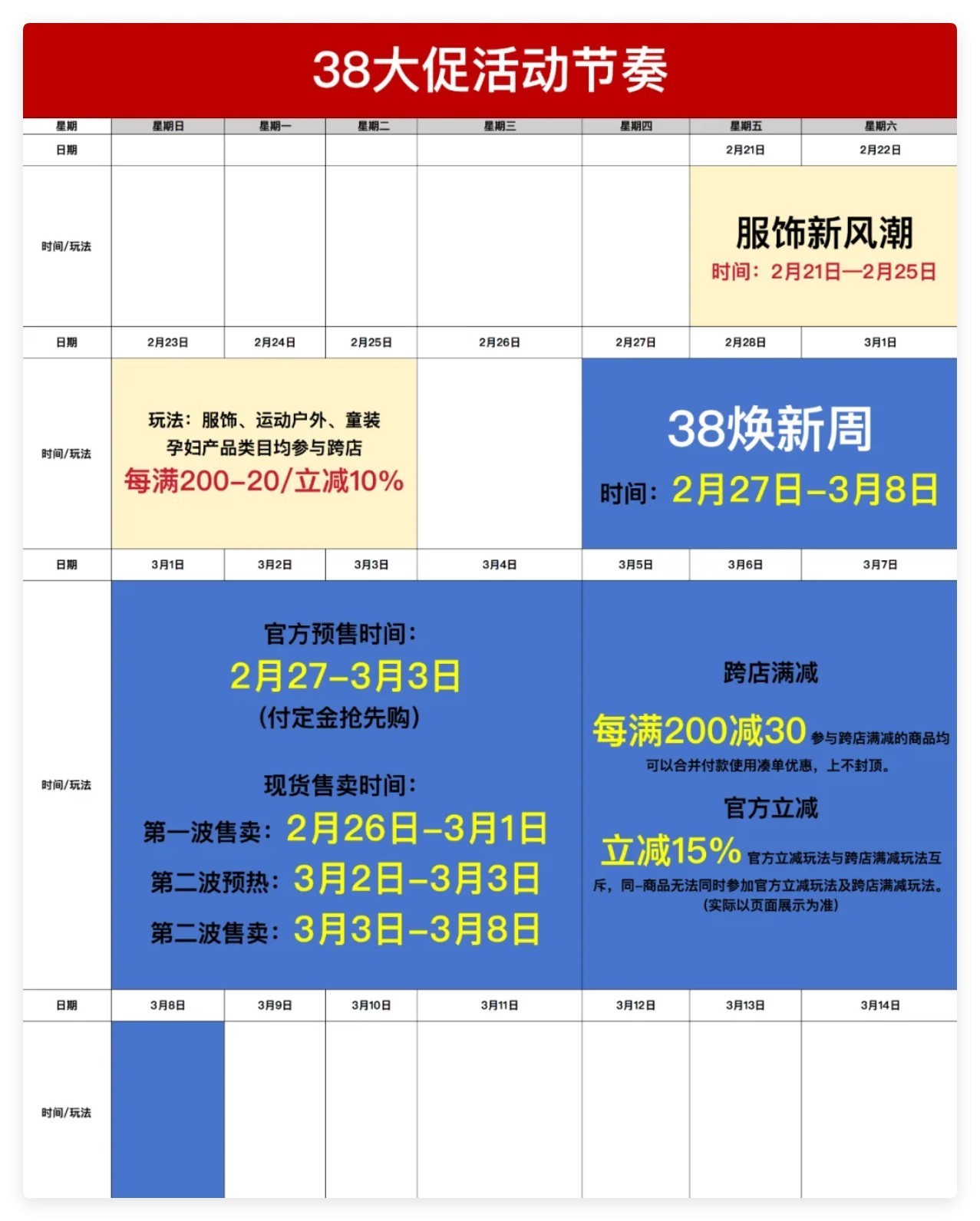 预热期:3月1日-3月7日(品牌日轮动,每日主推不同品类)