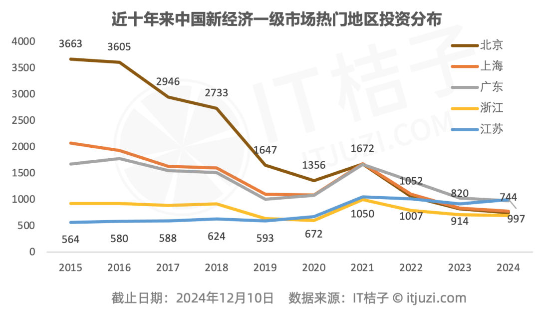 值得注意的是,近三年来,江苏实现接连反超,2023 年首次超过北京、上海,位居第二,2024 年则首次超过广东,跃居第一,成为国内创投最活跃区域。