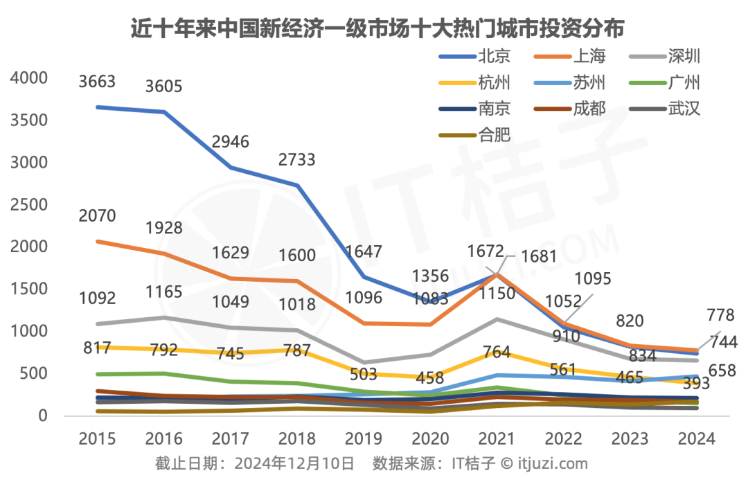 从数据趋势可见,各城市投资数量在近十年均呈现出一定的下降趋势。北京、上海、深圳作为传统的投资热门城市,尤其是北京,投资数量在早期(2015-2016 年)显著高于其他城市,后续下降幅度相对较大。