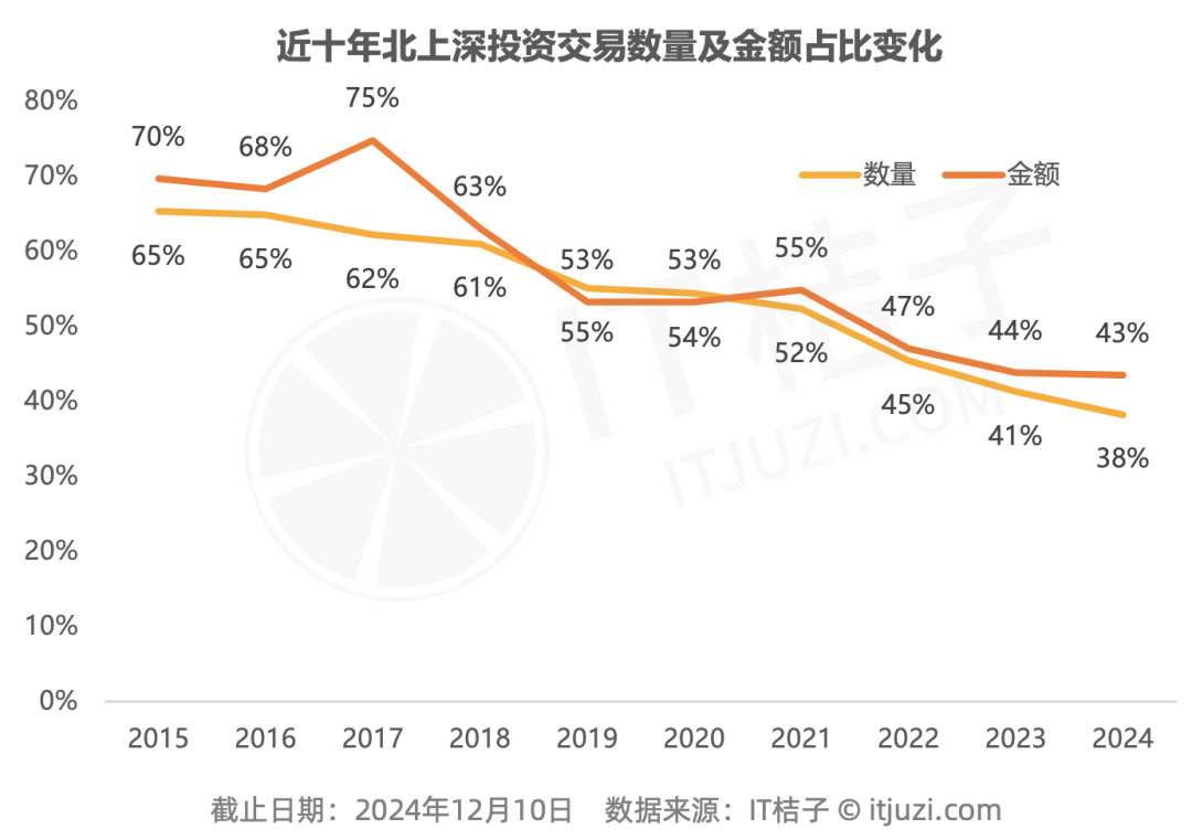 上图展示了北上深三座城市的投资交易在当年的占比。