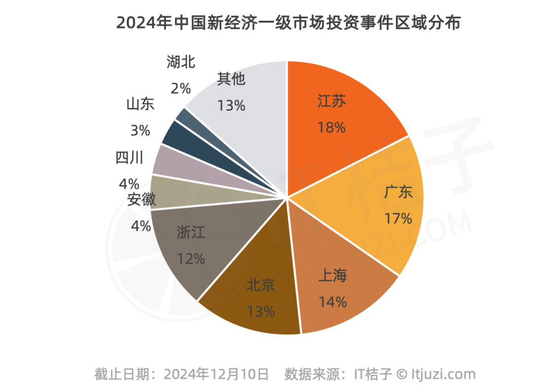 IT 桔子数据显示,2024 年江苏的融资事件最多,发生 997 起,占比 18%;广东发生融资事件 977 起,占比 17%;上海、北京、浙江分别发生 778、744 和 696 起投资事件,各占 14%、13% 和 12%。这五个省市成为创投最活跃的五大区域。
