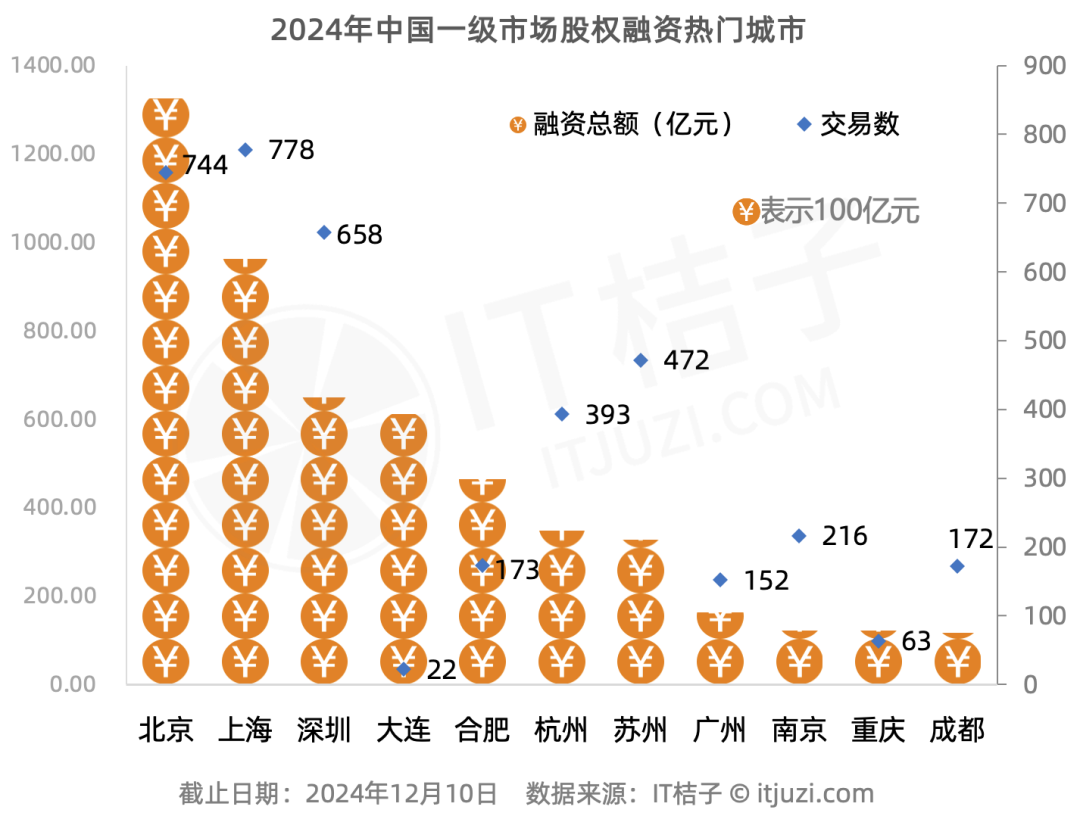 从投融资交易数量来看,2024 年国内融资最活跃的前十一个城市分别是上海(778 起)、北京(744 起)、深圳(658 起)、苏州(472 起)、杭州(393 起)、南京(216 起)、合肥(173 起)、成都(172 起)、广州(152 起)、重庆(63 起)、大连(22 起)。