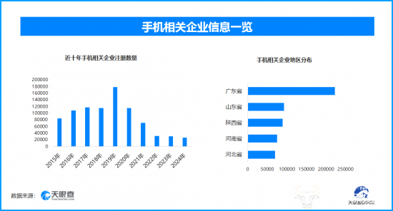 从区域分布来看,广东省手机相关企业数量位居首位,为22.2万余家,占全国企业总数的17.7%。排在其后的是山东省、陕西省、河南省和河北省,均在10万家以下的数量级。