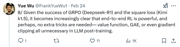 鉴于 GRPO(Deepseek-R1)和平方损失(Kimi k1.5)的成功,端到端强化学习的强大作用愈发凸显,或许在大型语言模型(LLM)后训练阶段无需额外技巧——价值函数、广义优势估计(GAE),甚至梯度裁剪都无需使用。