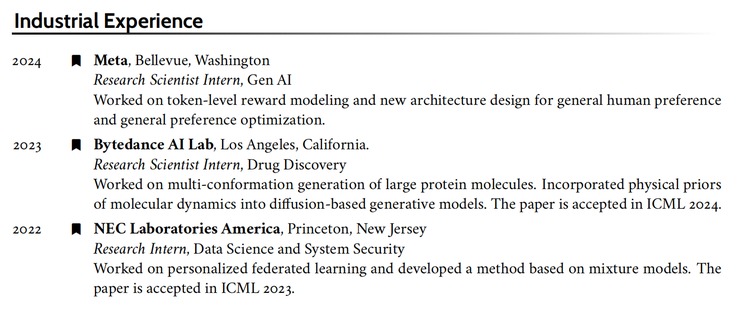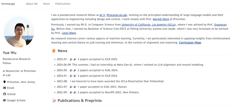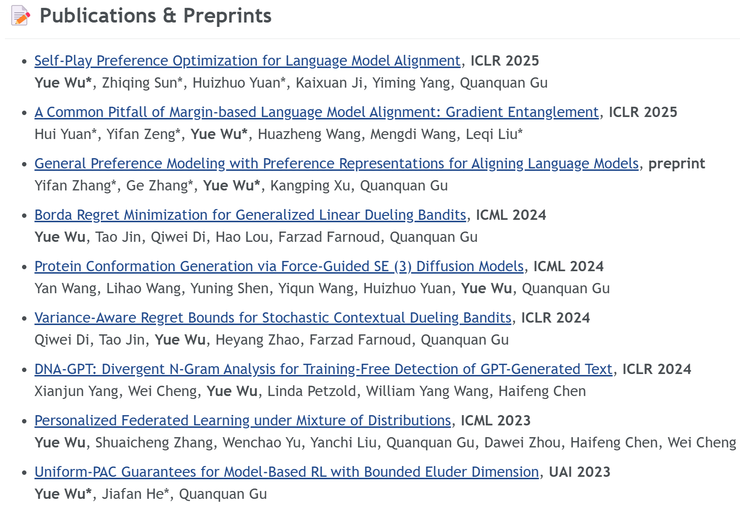强大的学术背景之外,Wu Yue 的实习经历也非常加分。2022 年至 2024 年,他分别在 NEC 美研院、字节美国 AI lab和 Meta 工作实习。在 NEC 美研院期间,Wu Yue 从事个性化联邦学习研究,并开发了一种基于混合模型的方法,该方法被 ICML 2023 接受发表;在字节美国 AI lab 时,他专注于药物发现领域的多构象生成,将分子动力学的物理先验纳入基于扩散的生成模型,相关成果被 ICML 2024 接受;来到 Meta 后,Wu Yue 又致力于词汇级别奖励建模和新架构设计,用于一般人类偏好和一般偏好优化,为生成式人工智能的发展做出了贡献。