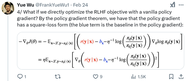 让我们感兴趣的是,我们发现它与 RLHF 目标的策略梯度有着深层的联系:如果我们直接用普通的策略梯度优化 RLHF (人类反馈强化学习)目标会怎样?根据策略梯度定理,策略梯度实际上也具有平方损失形式(蓝色项是策略梯度中的基线):
