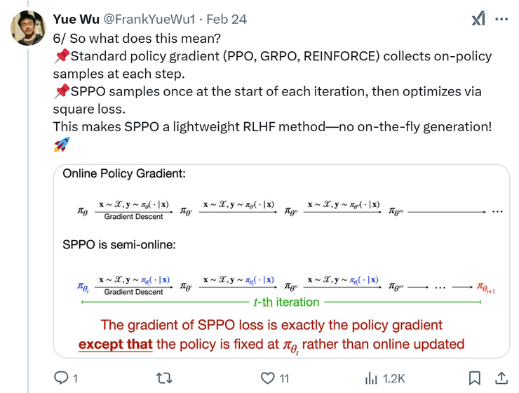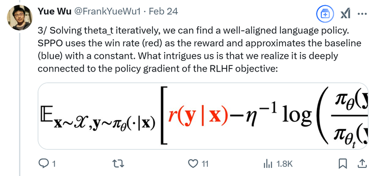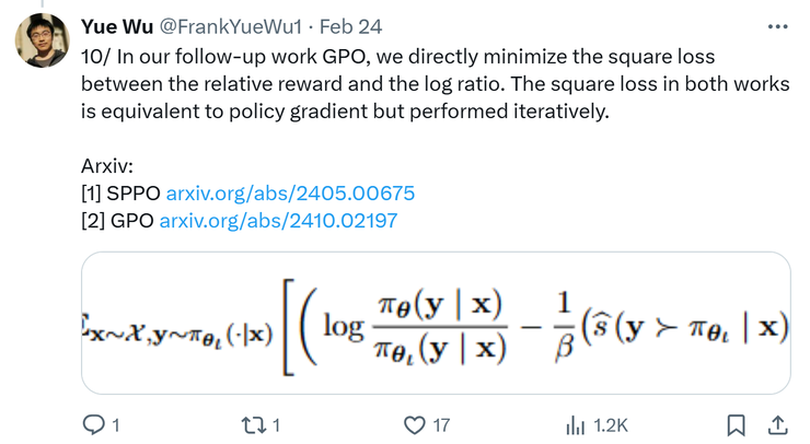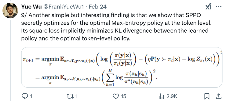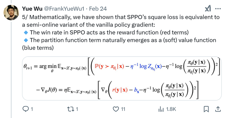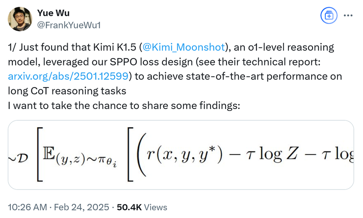但在一个月后的 2 月 24 日,X 上出现了一篇关于 Kimi k1.5 的技术爆料帖,博主直言 k1.5 所用到的强化学习算法,其实是借鉴了自己在 24 年 5 月提出的一种名为 SPPO 的技术。