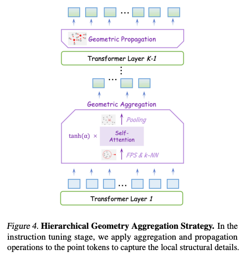 在无编码器架构中,LLM 本身并没有明确的局部建模模块。自注意力机制主要用于建模全局交互。因此,基于提出的混合语义损失,作者在指令调优阶段探索如何使 LLM 主动感知 3D 局部细节,并补充学到的全局语义。为此,他们提出了层次几何聚合策略。