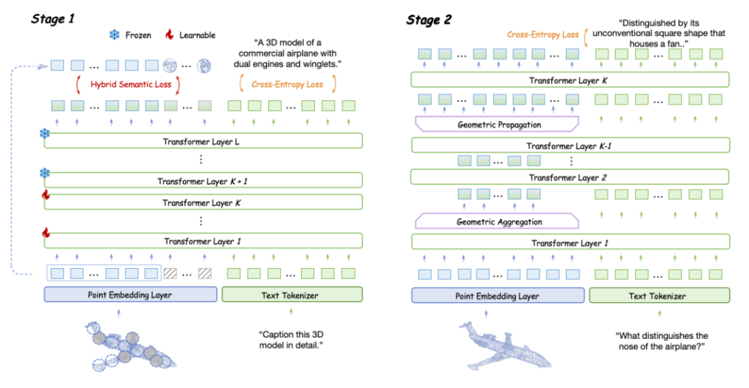 在两阶段训练过程中,每个阶段使用的数据集和预处理方法与 PointLLM 一致。所有训练均在 4 张 80G 的 A100 GPU 上以 BF16 精度进行,使用了 FlashAttention、AdamW 优化器以及余弦学习率调度策略。在预训练阶段,模型训练了 3 个 epoch,批量大小为 128,学习率为 4e-4。在指令微调阶段,训练进行了 3 个 epoch,批量大小为 32,学习率为 2e-5。